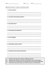 Arbeitsblatt mit Fragen zum Thema "Gehirn"